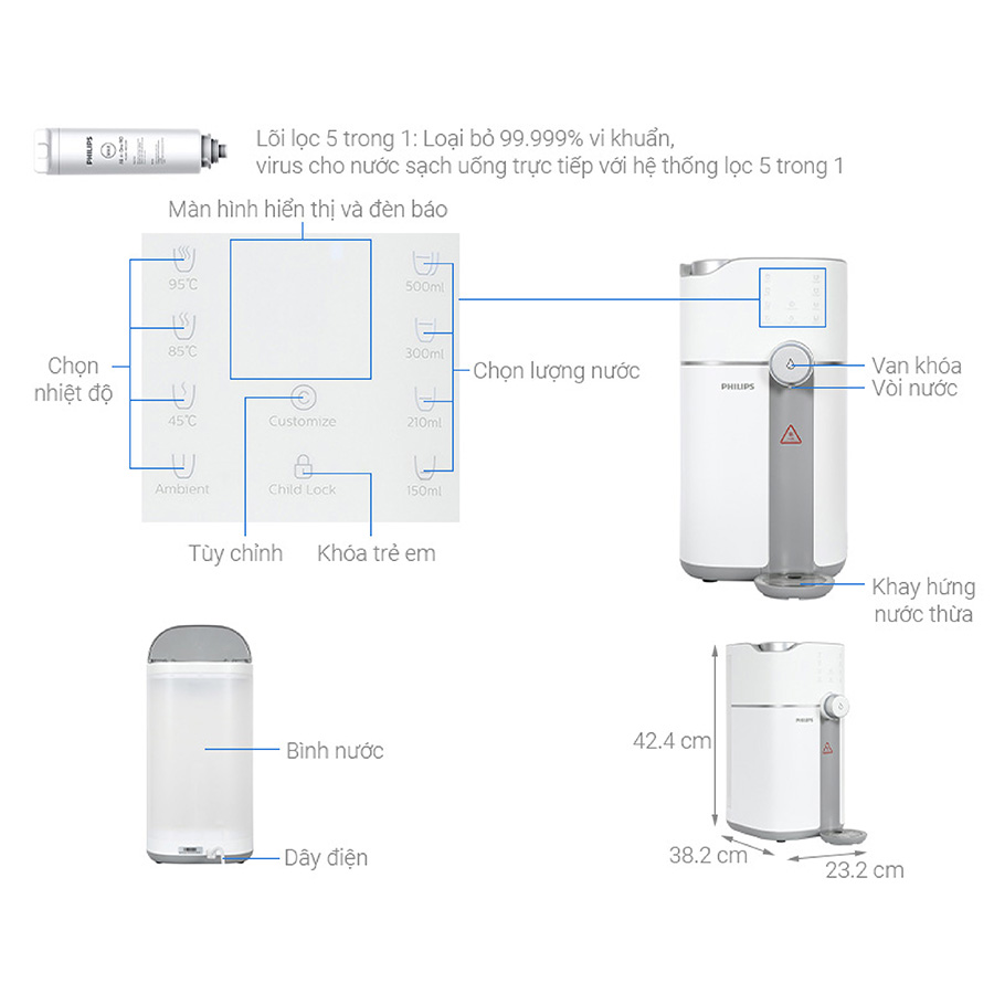 Đây là tính năng được rất nhiều bà nội trợ, bà mẹ bỉm sữa yêu thích vì bạn có thể tự ý rót ra đúng lượng nước yêu cầu, phục vụ pha chế đồ uống, pha sữa cho trẻ hoặc cân đối lượng nước nạp vào cơ thể mỗi ngày. Với 4 mực nước cho phép là 150ml, 210ml, 300ml, 500ml, bạn có thể thoải mái sử dụng theo nhu cầu. Không cần sử dụng cốc có vạch đo lường, đảm bảo tính chính xác cao nhất.