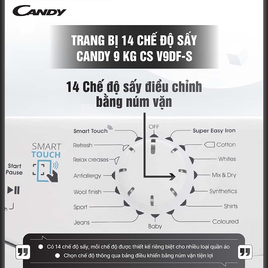 Máy sấy Candy CS V9DF-S nổi bật với tổng cộng 14 chương trình sấy chuyên biệt, mang đến sự linh hoạt tối ưu cho người dùng trong việc chăm sóc từng loại vải khác nhau. Từ những món đồ dày nặng đến các chất liệu mỏng nhẹ, từ quần áo hàng ngày đến đồ thể thao hay đồ len cao cấp, tất cả đều được xử lý đúng cách, đảm bảo hiệu quả sấy khô và bảo vệ sợi vải tối đa.