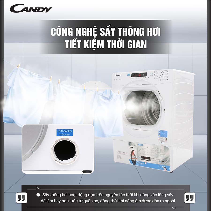 Máy sấy Candy ứng dụng công nghệ sấy thông hơi hiện đại, mang lại hiệu quả sấy khô nhanh chóng và tiết kiệm thời gian tối ưu cho người dùng. Cơ chế sấy thông hơi hoạt động dựa trên nguyên tắc thổi khí nóng vào lồng sấy để làm bay hơi nước từ quần áo, đồng thời khí nóng ẩm được dẫn ra ngoài qua một ống thoát khí chuyên dụng. Nhờ đó, quá trình sấy diễn ra liên tục và hiệu quả hơn, giúp quần áo khô đều, mềm mại mà không bị quá nhiệt hay hư tổn.