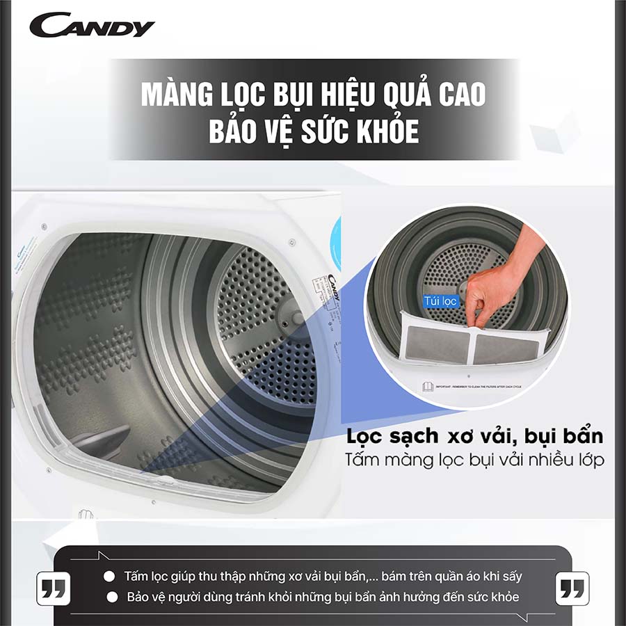 Không chỉ giúp làm khô quần áo nhanh chóng, máy sấy quần áo Candy CS V9DF-S còn góp phần bảo vệ sức khỏe người dùng nhờ vào tấm lọc bụi vải thông minh. Trong quá trình sấy, máy liên tục lọc và giữ lại các hạt bụi vải nhỏ li ti, xơ vải, lông thú cưng hay các tạp chất bám trên quần áo những yếu tố có thể gây kích ứng da hoặc ảnh hưởng đến hệ hô hấp nếu hít phải trong thời gian dài.