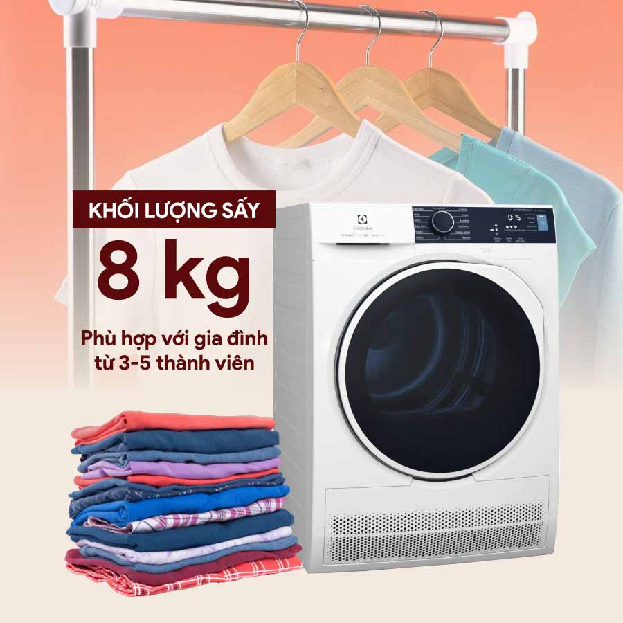 Với khối lượng sấy lên đến 8kg, chiếc máy sấy này đáp ứng tốt nhu cầu sấy quần áo của gia đình có từ 3-5 thành viên. Bạn có thể sấy một lượng lớn quần áo cùng một lúc, giúp tiết kiệm thời gian và công sức trong việc chăm sóc quần áo của gia đình.