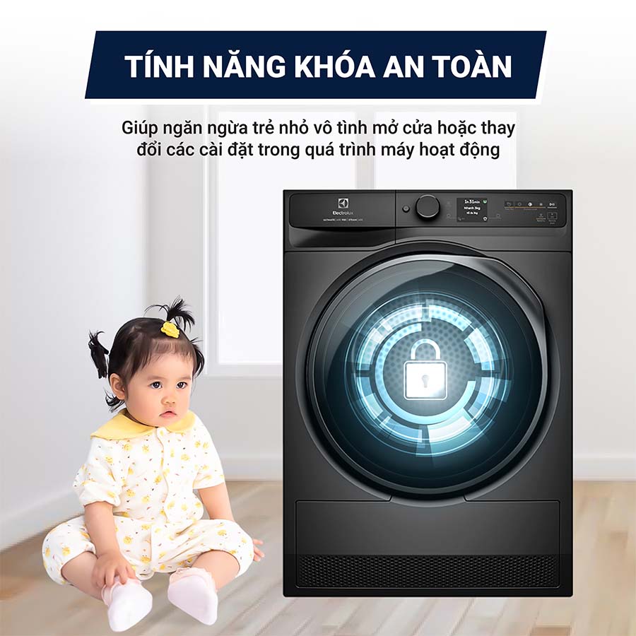 Khi kích hoạt khóa trẻ em, mọi nút bấm trên bảng điều khiển sẽ được vô hiệu hóa, ngăn chặn việc thay đổi chương trình hoặc tắt máy đột ngột. Điều này đảm bảo an toàn tuyệt đối, tránh được các sự cố không mong muốn và giúp bạn hoàn toàn yên tâm trong quá trình sử dụng máy sấy.