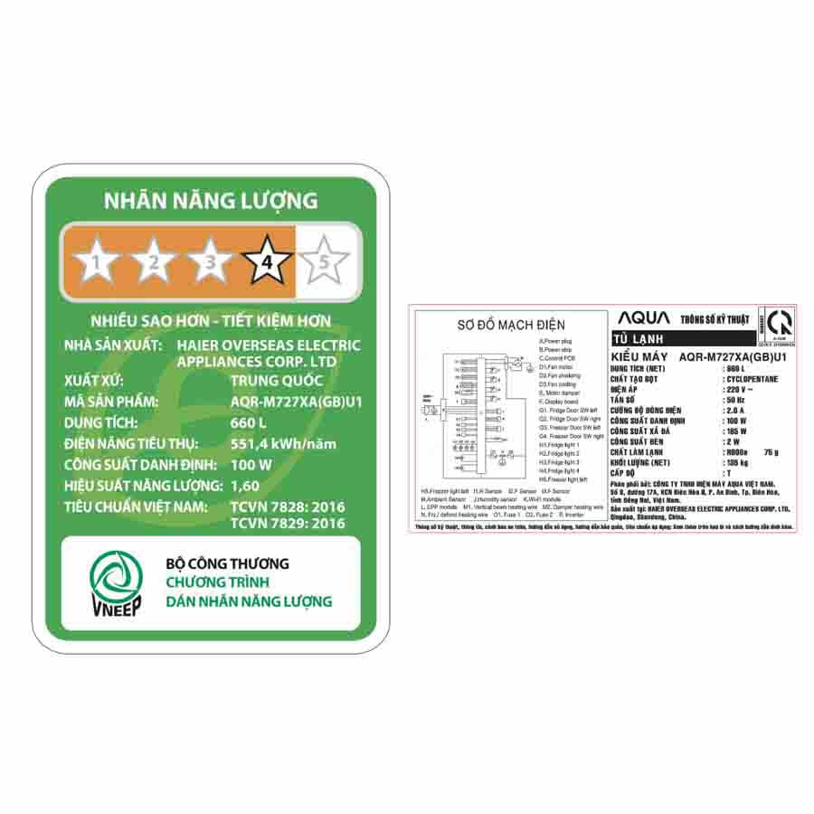 Tủ lạnh Aqua Inverter 660 lít Multi Door AQR-M727XA(GB)U1 là tủ lạnh 4 cửa sang trọng và hiện đại với dung tích sử dụng lớn 660 lít, phù hợp cho gia đình từ 5 thành viên trở lên và những ai có nhu cầu lưu trữ thực phẩm nhiều. Sản phẩm nổi bật với mặt gương đen sang trọng làm nổi bật không gian bếp, công nghệ Twin Inverter giúp tiết kiệm điện năng và vận hành êm ái, đồng thời tích hợp tính năng kháng khuẩn và khử mùi ABT Pro giữ không gian tủ luôn thoáng mát. Tủ còn hỗ trợ điều khiển bằng điện thoại thông minh thông qua ứng dụng Haismart và bảng điều khiển cảm ứng đa sắc màu bên ngoài, giúp người dùng thao tác dễ dàng và nhanh chóng.